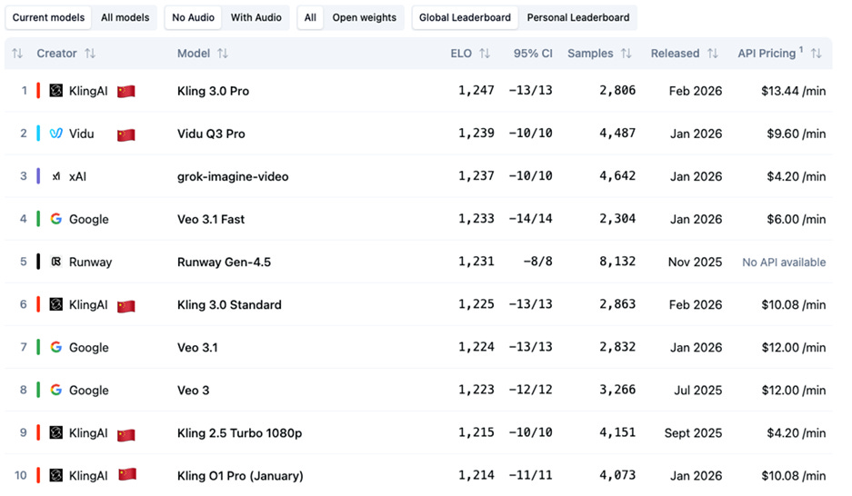 Figure 2: Artificial Analysis’ Text-to-Video Arena Global Leaderboard: 5 of top 10 are Chinese. (Feb 15, 2026)